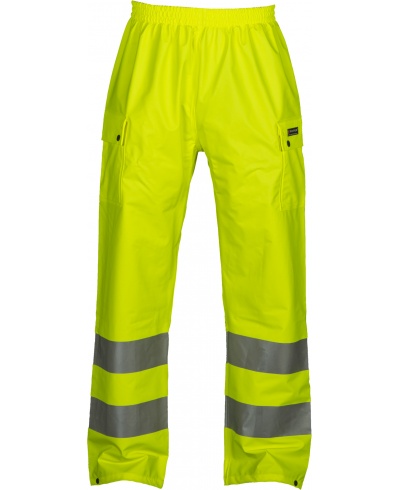 High-visibility rain trousers with 3M stripes, elasticated waist, two side pockets with flap and buttons, adjustable leg bottom with snap fastener, heat taped seams