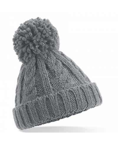 TearAway label for ease of rebranding, cuffed design for optimal decoration, heavyweight melange cable knit, hand-knitted feel, cotton Jersey lining for comfort and breathability, non-removable pom pom for added safety, self-coloured pom pom