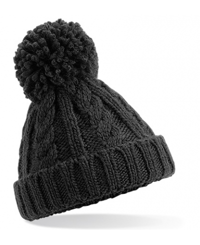 TearAway label for ease of rebranding, cuffed design for optimal decoration, heavyweight melange cable knit, hand-knitted feel, cotton Jersey lining for comfort and breathability, non-removable pom pom for added safety, self-coloured pom pom