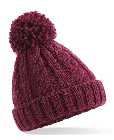 TearAway label for ease of rebranding, cuffed design for optimal decoration, heavyweight melange cable knit, hand-knitted feel, cotton Jersey lining for comfort and breathability, non-removable pom pom for added safety, self-coloured pom pom