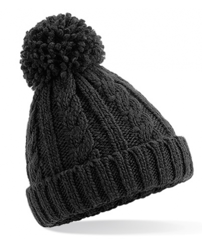 TearAway label for ease of rebranding, cuffed design for optimal decoration, heavyweight melange cable knit, hand-knitted feel, cotton Jersey lining for comfort and breathability, non-removable pom pom for added safety, self-coloured pom pom