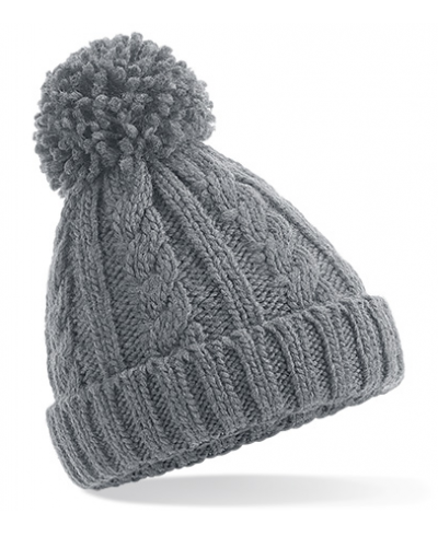 TearAway label for ease of rebranding, cuffed design for optimal decoration, heavyweight melange cable knit, hand-knitted feel, cotton Jersey lining for comfort and breathability, non-removable pom pom for added safety, self-coloured pom pom