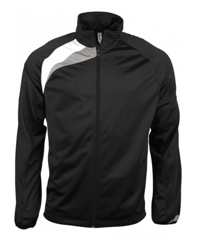 100% Polyester tricot. Full length front zip. Contrast panels. 2 side pockets. Elasticated cuffs. Can be combined with PA102 to make a tracksuit.