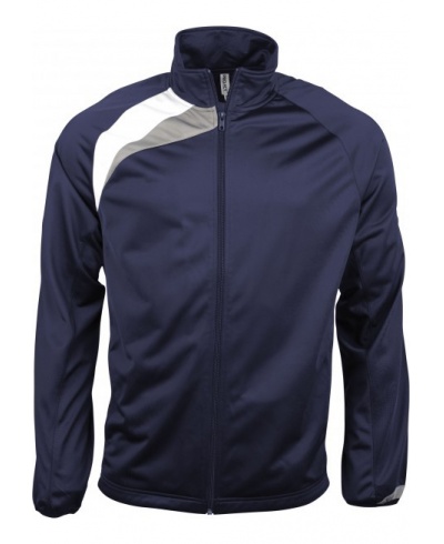100% Polyester tricot. Full length front zip. Contrast panels. 2 side pockets. Elasticated cuffs. Can be combined with PA102 to make a tracksuit.