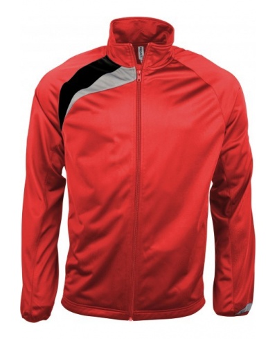 100% Polyester tricot. Full length front zip. Contrast panels. 2 side pockets. Elasticated cuffs. Can be combined with PA102 to make a tracksuit.