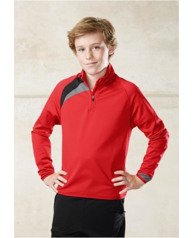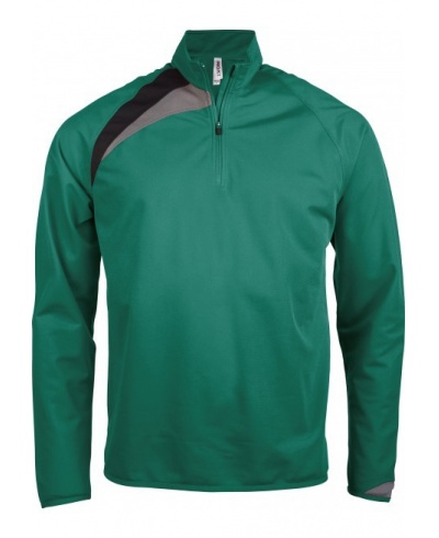 100% polyester brushed polytricot. Zip neck. Contrast panel details. Matching coverstitch. Elasticated hem and cuffs.