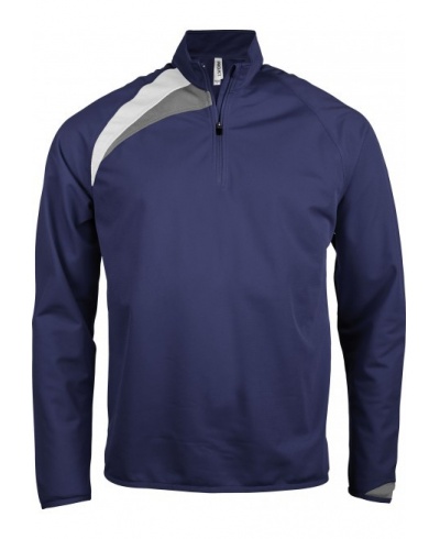 100% polyester brushed polytricot. Zip neck. Contrast panel details. Matching coverstitch. Elasticated hem and cuffs.