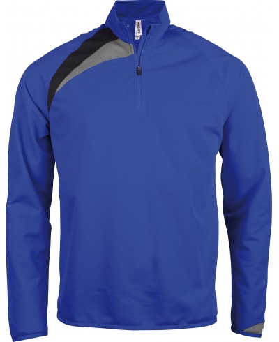 100% polyester brushed polytricot. Zip neck. Contrast panel details. Matching coverstitch. Elasticated hem and cuffs.