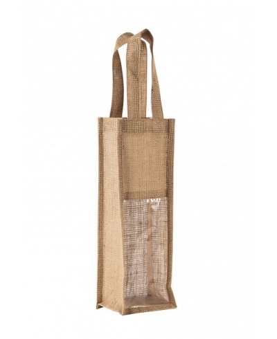 Jute canvas bottle bag, with 2 handles and transparent PVC window on front. Designed for 1 bottle.
