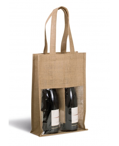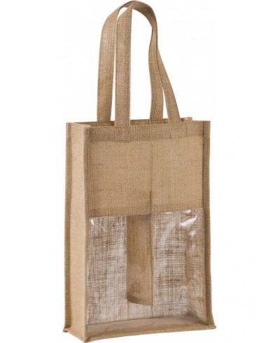 Jute canvas bottle bag, with 2 handles and transparent PVC window on front. Designed for 2 bottles.
