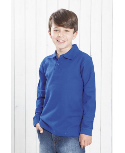 Kids long sleeve polo Unisex with cuffs. Honey combed fabric. Two buttons placket. 1x1 Rib collar and cuffs. Side slits.
