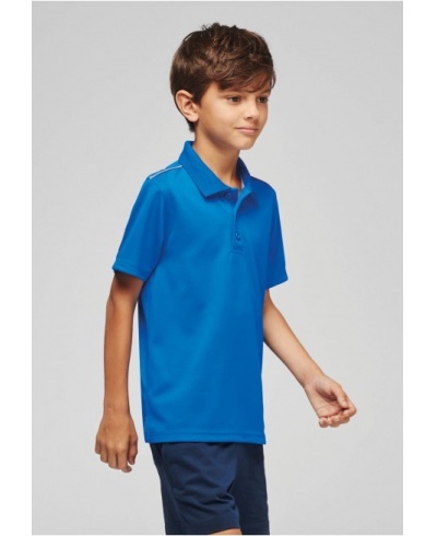 100 % polyester interlock. Quick-drying fabric. Rib neck. 3-button placket. Contrast taped neck and side slits. Contrast piping on shoulders. Twin needle finishing on cuffs and hem.