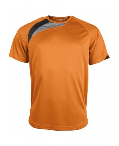 100% polyester. Quick drying fabric. Contrast panels. Matching coverstitch finishing. Twin needle finishing.