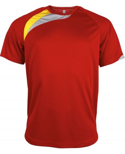 100% polyester. Quick drying fabric. Contrast panels. Matching coverstitch finishing. Twin needle finishing.