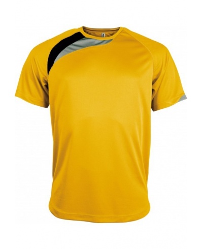 100% polyester. Quick drying fabric. Contrast panels. Matching coverstitch finishing. Twin needle finishing.