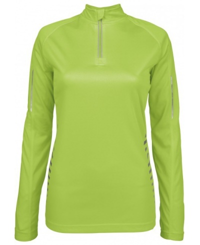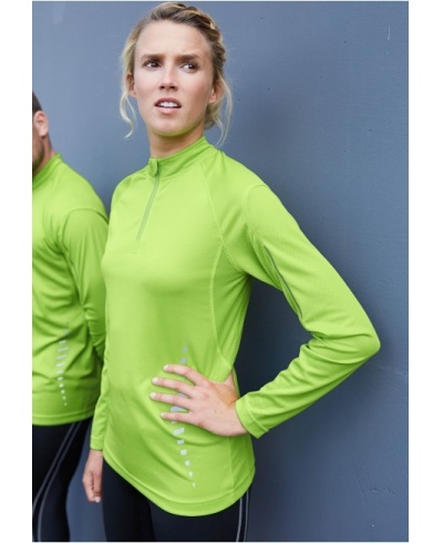 100% polyester. Quick dry fabric. Zip neck with reflective detail. Raglan sleeves. Front and back reflective trim details. Twin needle finishing.