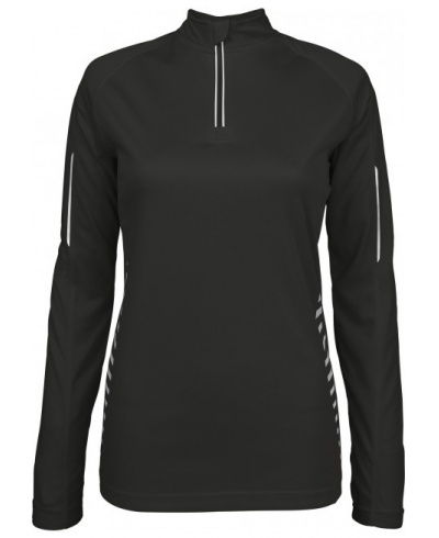 100% polyester. Quick dry fabric. Zip neck with reflective detail. Raglan sleeves. Front and back reflective trim details. Twin needle finishing.