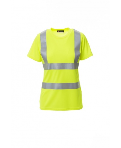 Women's short-sleeved, round neck high visibility T-shirt with reflective stripes, covered neck seam