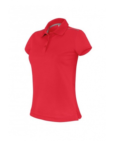 100% polyester interlock. Flat knit collar. 3 button placket. Contrast taped neck and side vents. Contrast piping at shoulder. Twin needle finishing.