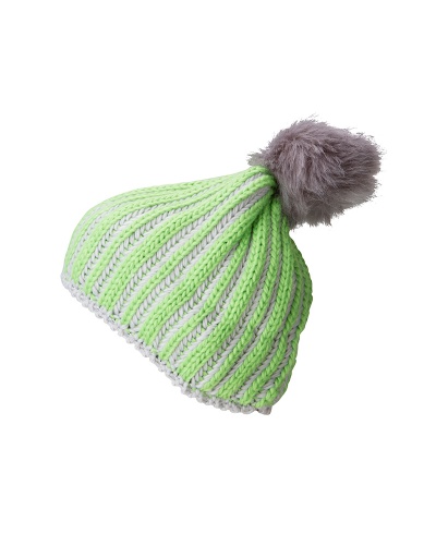 Knitted cap with contrasting stripe and pompon