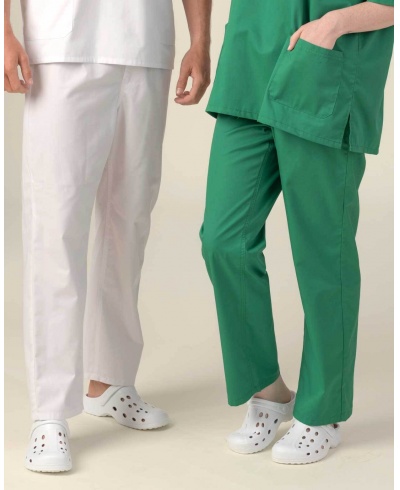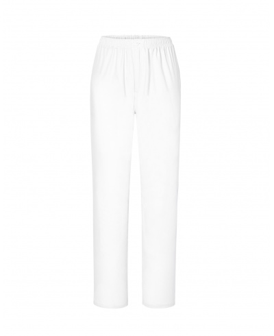 Elastic waistband with front button (4 holes with rim) and fly zipper closure.