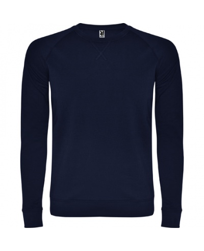 Long sleeve sweatshirt raglan sleeve style, trim, cuffs, hem and collar in 1x1 rib. Round neck with detail of overlocked crossed seams on front and reinforced covered seams in neck.