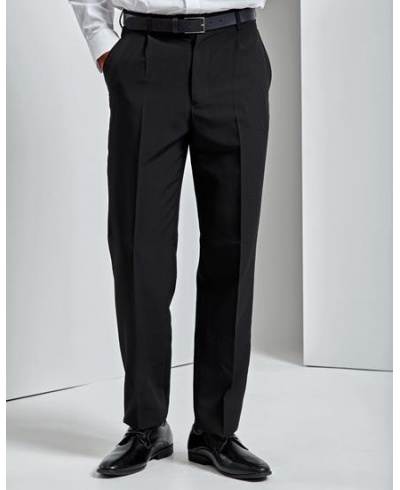 Men’s trousers with a single pleated front with two front swing pockets and a rear jetted pocket. These trousers have a zip fly fastening with a hook 'n' bar fastening at the waist as well as loops to support a belt. Available in two leg lengths.