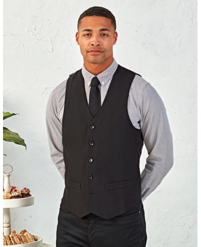 A men's waistcoat with five buttons and two functional watch pockets makes for a really stylish piece of hospitalitywear. This waistcoat is fully lined and comes with a satin-feel back where there is a buckle adjuster for a more fitted appearance.