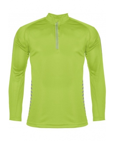100% polyester. Quick dry fabric. Zip neck with reflective detail. Raglan sleeves. Front and back reflective trim details. Twin needle finishing.