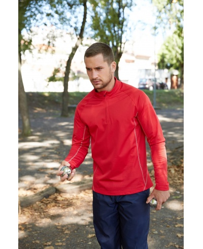 100% polyester poly tricot. Raglan sleeves. Contrast topstitching.