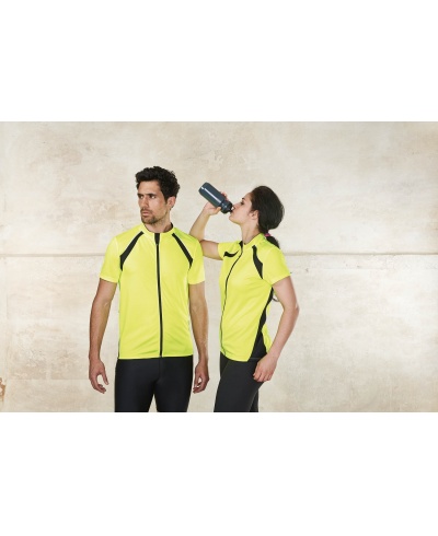 100% polyester. Quick drying fabric. Full front zip. 3 rear pockets. 1 small zipped pocket. Elasticated hem with inner anti slip silicone band. Reflective piping front and back.
