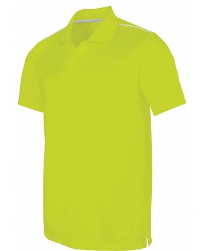 100% polyester interlock. Flat knit collar. 3 button placket. Contrast taped neck and side vents. Contrast piping at shoulder. Twin needle finishing.