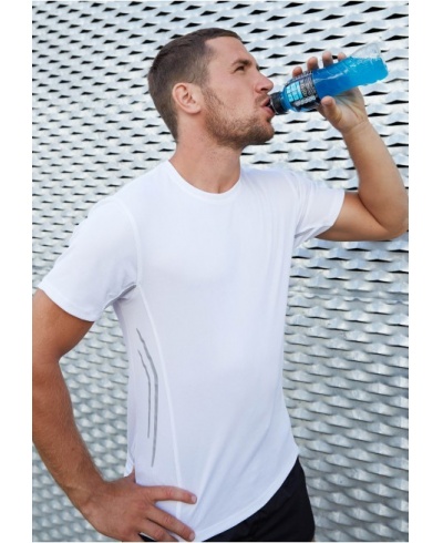 50% polyester Top Cool® / 50% polyester. Quick drying light weight fabric. Wicking fabric on back for comfort and performance. Front and back reflective design details. Short sleeves with front and back contrast piping. Contrast taped neck.