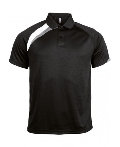 100% polyester. Quick drying fabric. Contrast panels. Flat knit collar. 2 button placket. Matching cover stitch. Twin needle finishing.