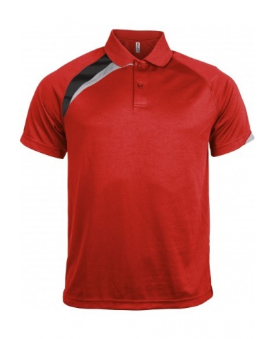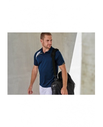 100% polyester. Quick drying fabric. Contrast panels. Flat knit collar. 2 button placket. Matching cover stitch. Twin needle finishing.