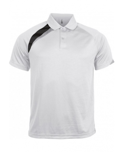100% polyester. Quick drying fabric. Contrast panels. Flat knit collar. 2 button placket. Matching cover stitch. Twin needle finishing.