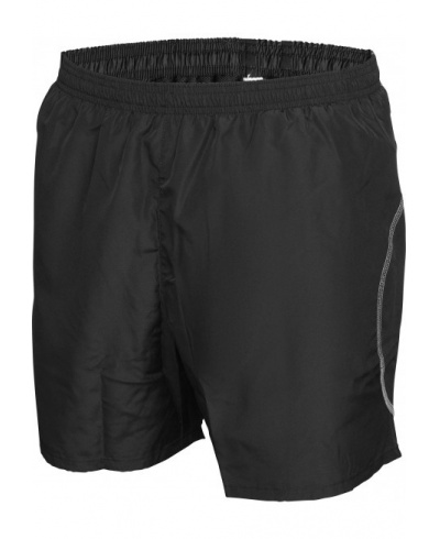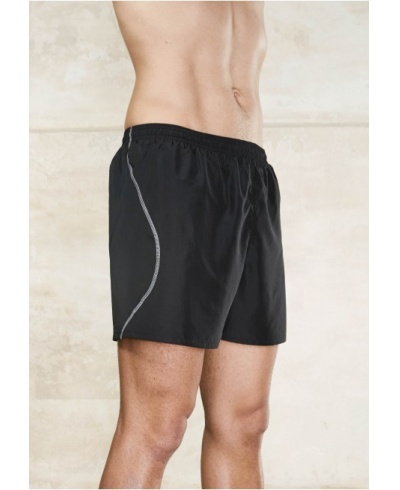 100% polyester. Quick drying light weight fabric. Elasticated waist with drawcord. Side panels with contrasted cover stitch. Built-in mesh underwear. Front small inner pocket.