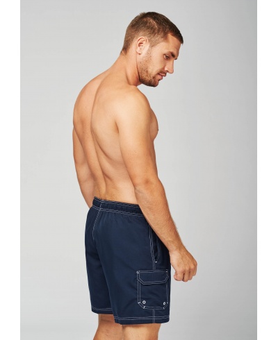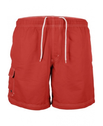 100% polyester microfiber. Quick dry peached fabric. Elasticated waist with inner drawcord. Meshed inner brief. 2 side pockets + 1 side pocket with flap and eyelet. Contrast topstich.