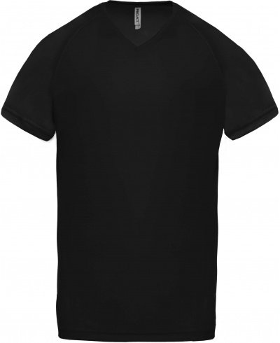 100 % polyester. Quick-drying fabric. Taped V-neck. Raglan sleeves with cover stitch. Twin needle finishing on cuffs and hem.