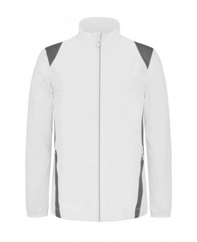 100% polyester microfiber. 2 front zipped pockets. Mesh yokes at shoulders and sides for moisture management. Reflective bands at sides and front zip. Small pocket on sleeve. Elasticated binding at cuffs.