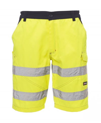 Men's Bermuda shorts, high visibility with reflective stripes, side elastic and waist belt loops, zip fastening with plastic button, two classic front pockets, one side pocket with LOCK SYSTEM, one tape measure pocket, two back pockets, one with flap and one open with Velcro flap. Contrasting triple seams on the crotch and inside leg