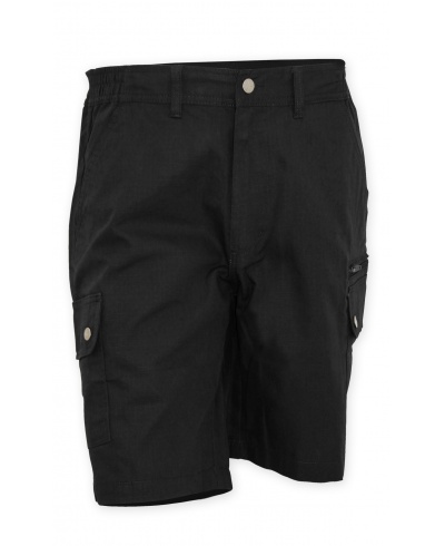 Bermuda shorts with side elastic and waist belt loops, zip fastening with button, two classic front pockets, two large side pockets with flaps and snap fasteners, one left secur zip pocket, one foldaway tape measure pocket on the right, two slit back pockets with button and buttonhole