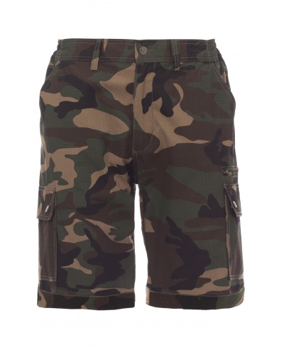 Bermuda shorts with side elastic and waist belt loops, zip fastening with button, two classic front pockets, two large side pockets with flaps and snap fasteners, one left secur zip pocket, one foldaway tape measure pocket on the right, two slit back pockets with button and buttonhole