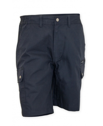 Bermuda shorts with side elastic and waist belt loops, zip fastening with button, two classic front pockets, two large side pockets with flaps and snap fasteners, one left secur zip pocket, one foldaway tape measure pocket on the right, two slit back pockets with button and buttonhole