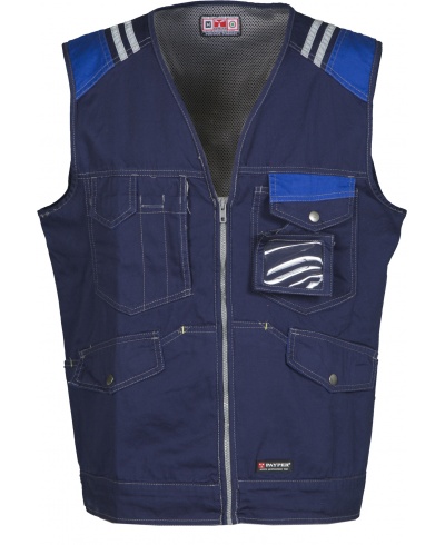 Men’s contrasting two-tone vest, jeans-type fitted cut, front fastening with zip, front zip fastener, two front kangaroo pockets with LOCK SYSTEM closing flap and metal button, two chest pockets, one with LOCK SYSTEM, detachable, foldaway badge holder, mobile phone holder; reflective piping on the back; reflective bands on the shoulder for greater safety and visibility; dry-tech lining