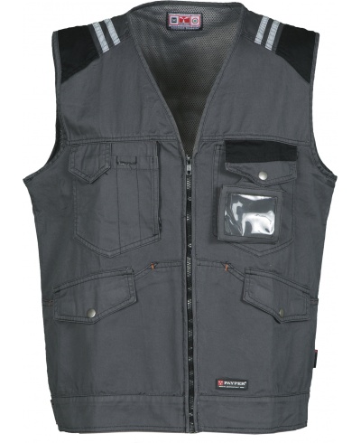 Men’s contrasting two-tone vest, jeans-type fitted cut, front fastening with zip, front zip fastener, two front kangaroo pockets with LOCK SYSTEM closing flap and metal button, two chest pockets, one with LOCK SYSTEM, detachable, foldaway badge holder, mobile phone holder; reflective piping on the back; reflective bands on the shoulder for greater safety and visibility; dry-tech lining.