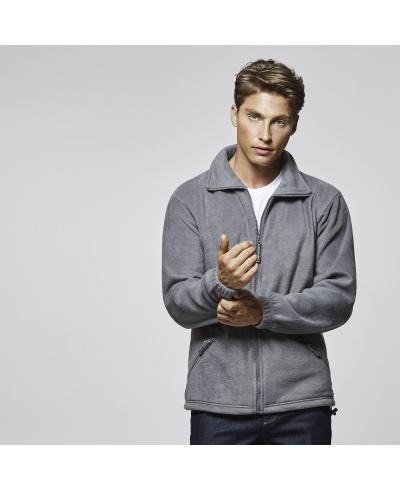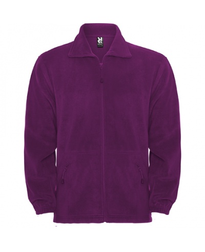 Fleece jacket, with high necked lined collar and matching full zipper. Side pocket with zipper, elastic cuffs and waist with side adjusters.