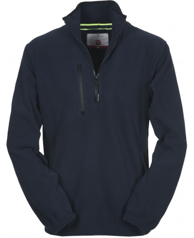 Fleece, with black plastic half zip, raglan sleeves, elasticated cuffs and waist, two pockets with concealed zip, one front zip pocket, neck with contrasting reinforcement tape, reinforced