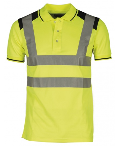 Men’s short-sleeved two-tone, high-visibility polo shirt with reflective stripes, with three, matching, mother-of-pearl effect buttons, contrasting fine rib collar and sleeve edging, side vents, concealed collar stitching