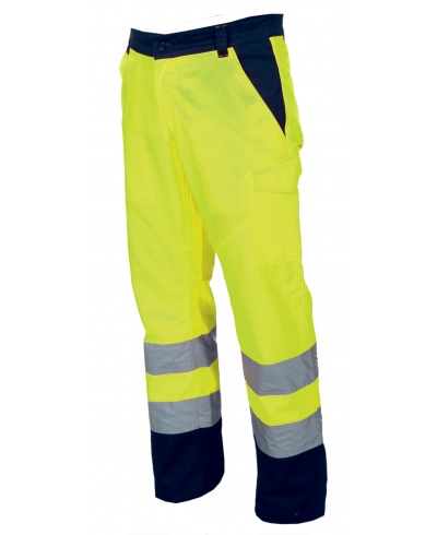 Men’s high visibility, two-tone winter flannel trousers with reflective stripes, side elastic and waist belt loops. Zip fastening with plastic button, two classic front pockets, one LOCK SYSTEM side pocket, a tape measure pocket, two back pockets, one open and one with flap and Velcro, contrasting stitching, triple seam crotch and inner leg